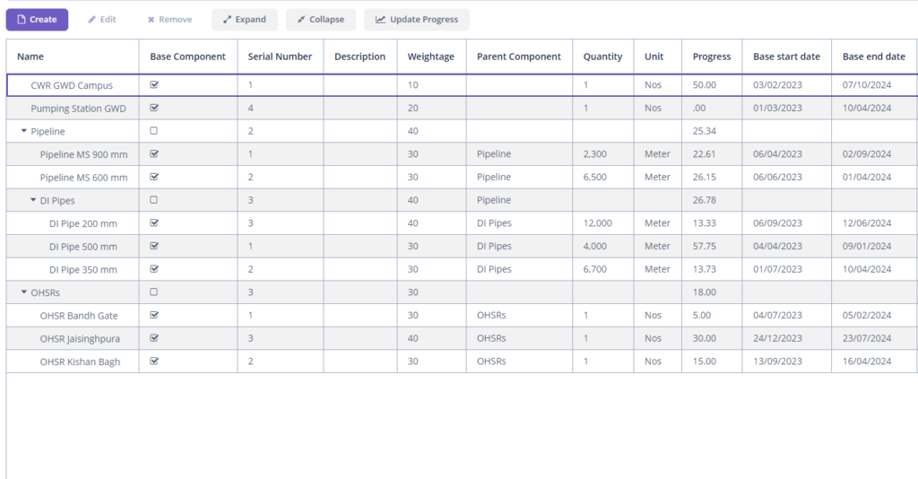 Projects are logically divided into components, each associated with specific construction stages. Overall progress is calculated based on the completion levels of these stages and their assigned weightages. For linear infrastructure like pipelines and roads, segment-wise and chainage-wise monitoring is available. All progress can be visualized on a geographic map, providing comprehensive oversight.