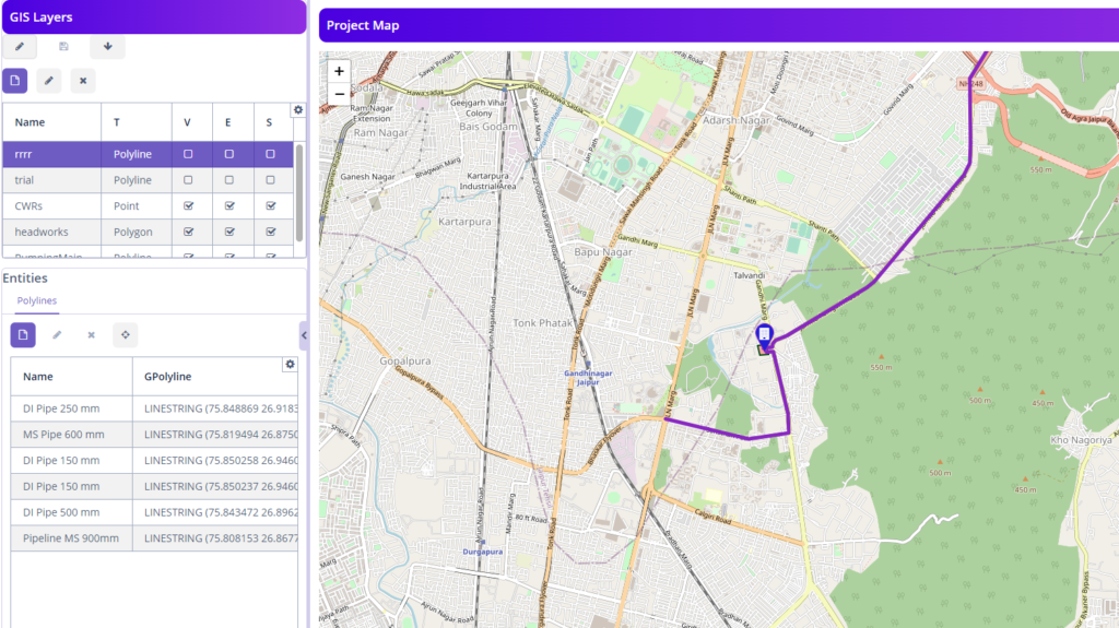 The system features a built-in GIS module, supporting the creation and editing of various geographical entities (points, polylines, polygons). Project elements, such as pipes or roads, can be imported from GeoJSON files and rendered to reflect physical progress. Updates to segment progress can be made directly through the map interface.
