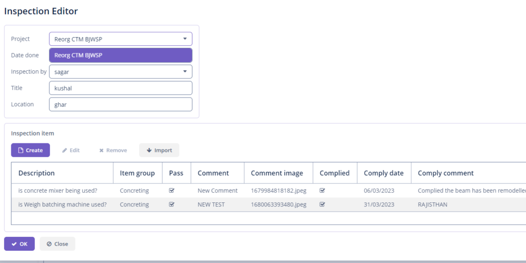 Online inspection can be carried out through BuildProSoft by Client, Managers, Supervisors etc. Facility to upload images is also provided. Any discrepancies found during inspections can be recorded and assigned. Facility to submit compliance report is also provided. A large number of templates for inspection are included in software i.e. pipeline laying, RCC Work, Masonry Work, Pump Installation etc