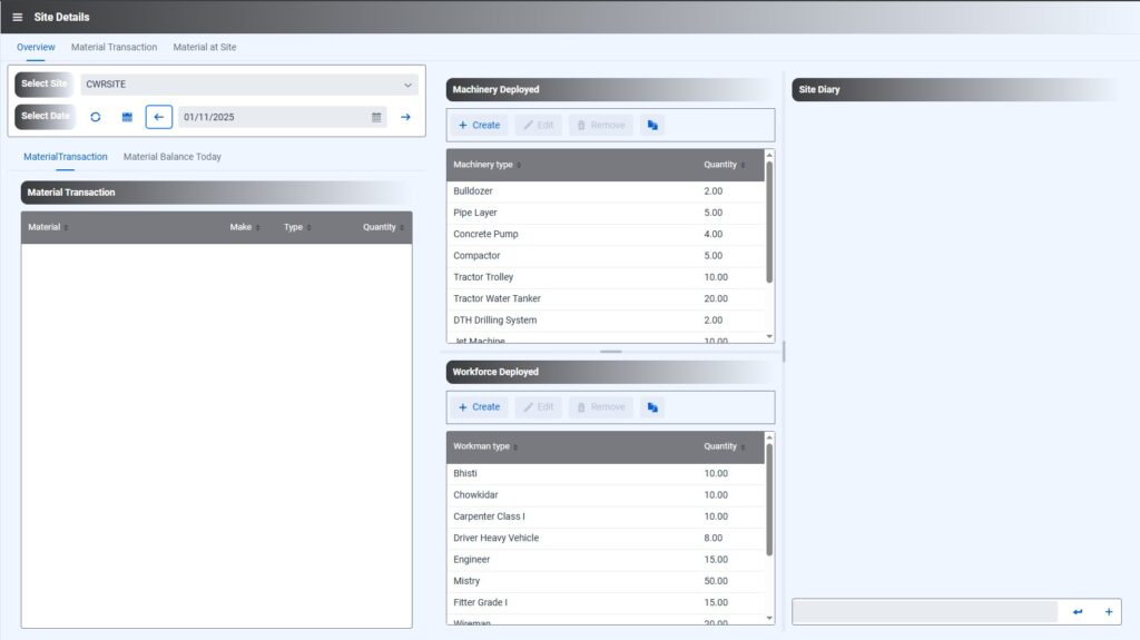 BuildProSoft enables detailed management of project sites, with daily records of deployed machinery and workforce. Material flow at each site is tracked, and a digital site book allows users to log messages, images, and videos detailing site activities such as inspections, weather, visits, and material receipts. All material movements, including issues, returns, and transfers, are automatically documented in site book.
